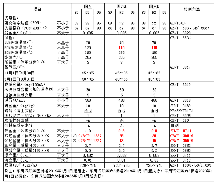 汽油质量的主要控制指标包括:抗爆性(研究法辛烷值、马达法辛烷值、抗爆指数)、硫含量、蒸汽压、烯烃含量、芳烃含量、苯含量、腐蚀、馏程等。