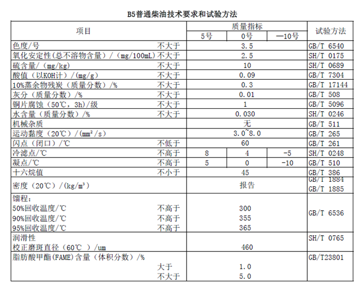 B5车用柴油:体积分数为1~5%的BD100生物柴油与体积分数为95~99%的除润滑性外其余指标满足GB19147的车用柴油的调合燃料。适用:压燃式发动机汽车使用的以生物柴油为调合组分的车用柴油。