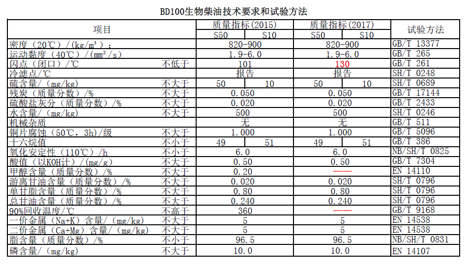 BD100生物柴油:按硫含量分S50和S10两个类别,分别指硫含量不超过50mg/kg和10mg/kg的生物柴油。