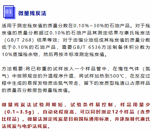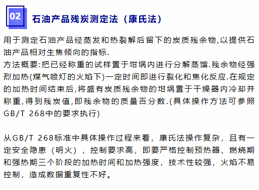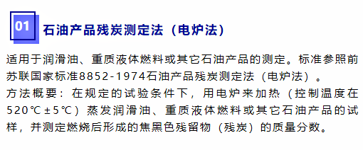 测定石油产品残炭的方法有SH/T 0170石油产品残炭测定法(电炉法)、GB/T 268石油产品残炭测定法(康氏法)、GB/T 17144石油产品残炭测定法(微量法)。