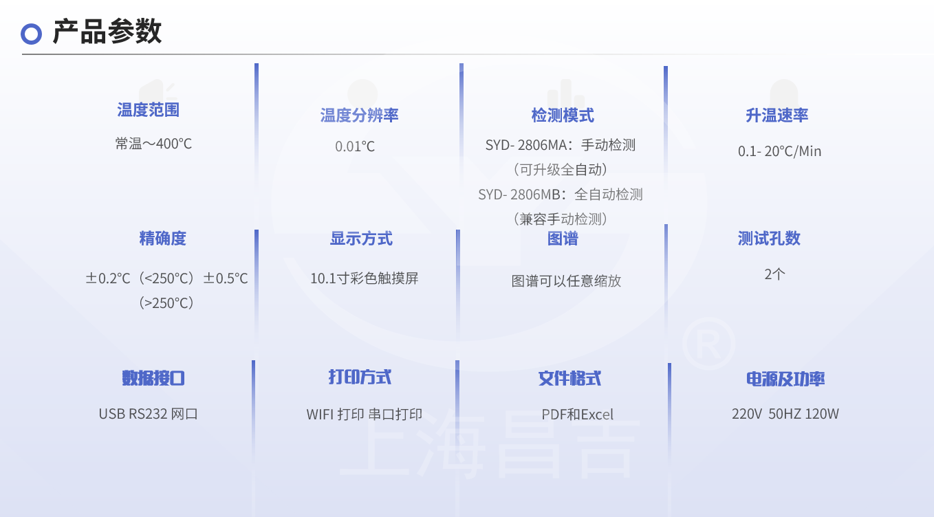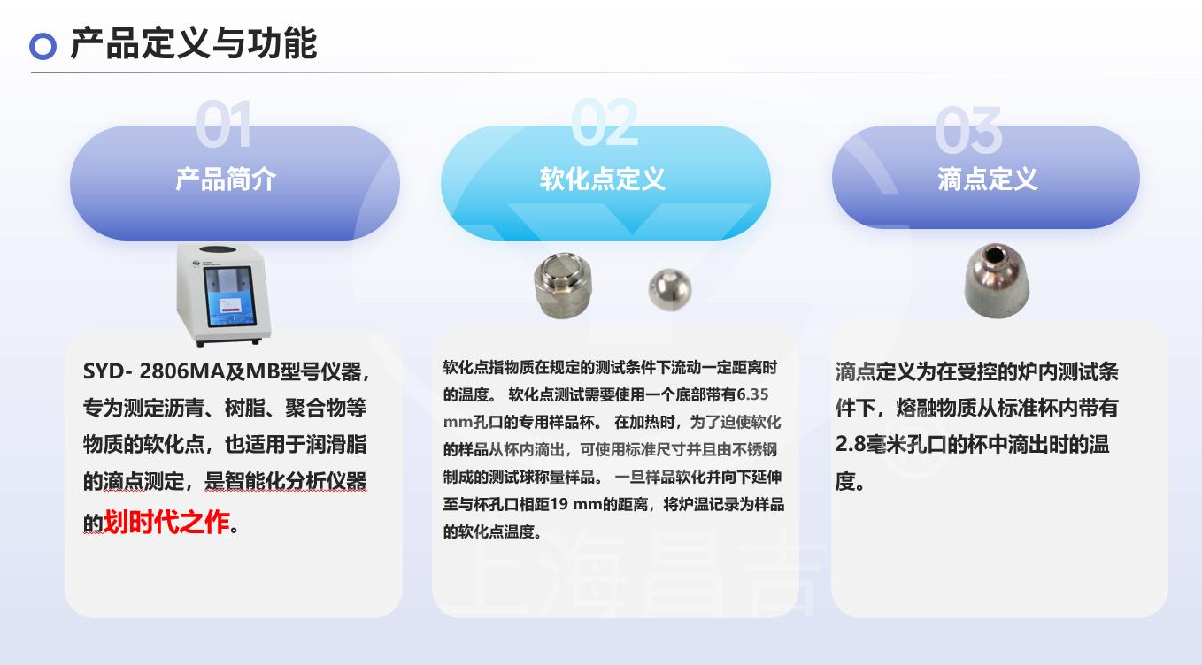 SYD- 2806MA及MB型号仪器,专为测定沥青、树脂、聚合物等物质的软化点,也适用于润滑脂的滴点测定,是智能化分析仪器的划时代之作