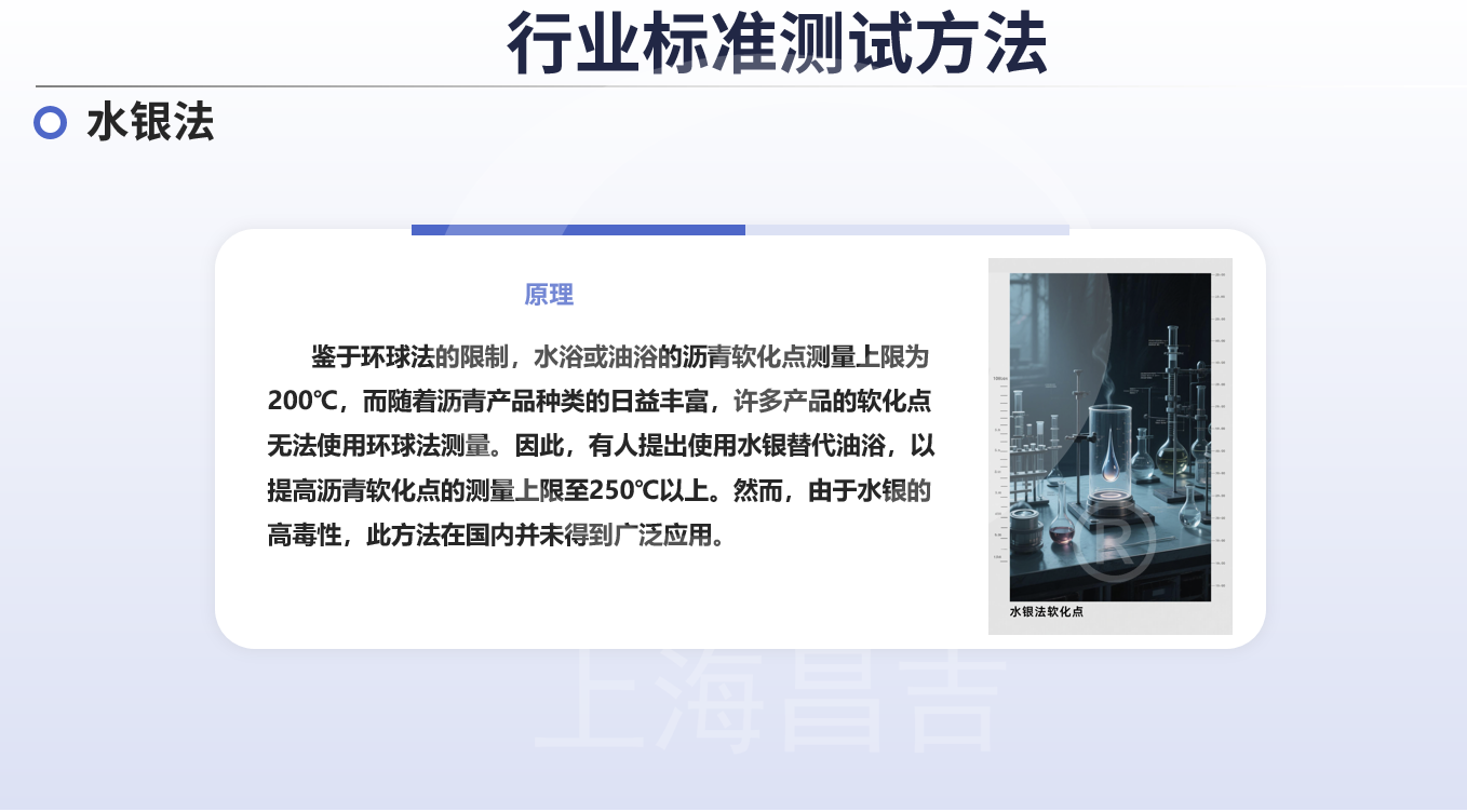 鉴于环球法的限制,水浴或油浴的沥青软化点测量上限为200℃,而随着沥青产品种类的日益丰富,许多产品的软化点无法使用环球法测量。因此,有人提出使用水银替代油浴,以提高沥青软化点的测量上限至250℃以上。然而,由于水银的高毒性,此方法在国内并未得到广泛应用。